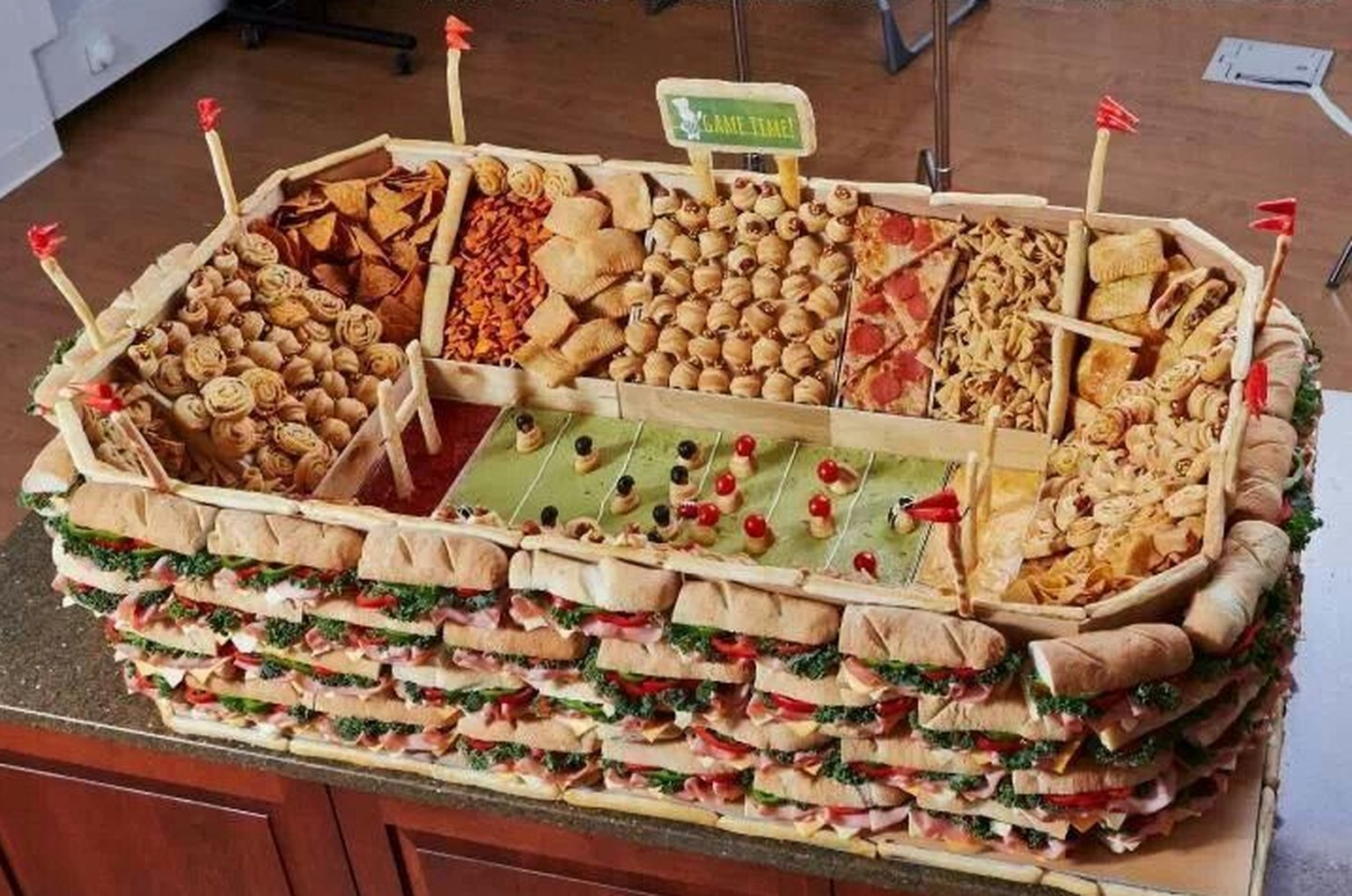 This cardstock stand features 8 compartments surrounding a large open field. • choose a surface on which to construct your stadium; Buy football snack stadium filled with sub sandwiches, veggies and chips. This year's stadium is filled with a variety of snacks. Normally snack stadiums are served cold, as they take a while to prepare, and you want your guests to be able to munch on them throughout the game.